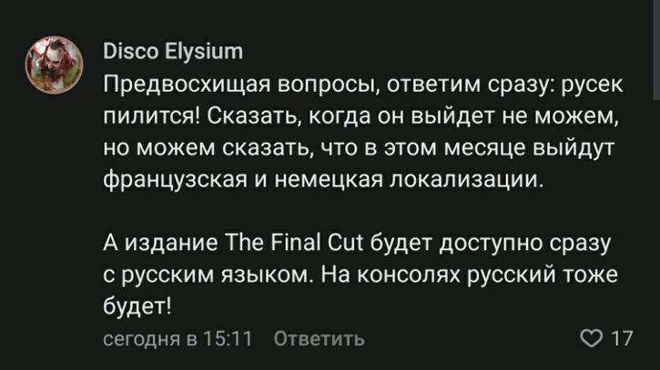 Во время церемонии награждения The Game Awards 2020 студия ZA/UM анонсировала выход ролевой игры с открытым миром Disco Elysium: Final Cut на PlayStation 4, PlayStation 5, PC и Google Stadia в марте 2021 года, после чего последует релиз на Xbox Series и Nintendo Switch летом 2021 года. Владельцы оригинальной игры получат контент издания Final Cut в качестве бесплатного обновления.