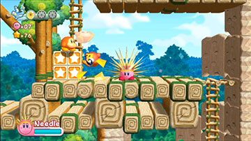 Практически в каждой игре серии присутствует своё фирменное умение. Когда в Kirby Triple Deluxe этой особенностью стала возможность поглощать всё и вся с многократной силой, то в Kirby’s Adventure Wii наш главный герой сможет овладеть способностями более сильных врагов. Их очень просто заметить – такие существа излучают белые свет, да и размером больше своих соратников. Скушав неудачливого противника, Кирби на короткий промежуток времени овладеет невероятной и крайне эффектной способностью: огромным мечом, не оставляющим даже самым крупным врагам никаких шансов или внушительной волшебной палочкой, магически очищающей весь экран от недоброжелателей за секунды. Одна способность даже обратит Кирби в огромный снежный шар, которому встать на пути смерти подобно! Такое нововведение прекрасно позволяет игроку почувствовать себя всесильным и носит в себе практический характер: только с помощью суперспособности можно открыть портал в другое измерение. Там вам предстоит выполнить небольшое испытание на время, после чего вас закинет к мини-боссу, наградой за победу над которым станут заветные шестеренки.