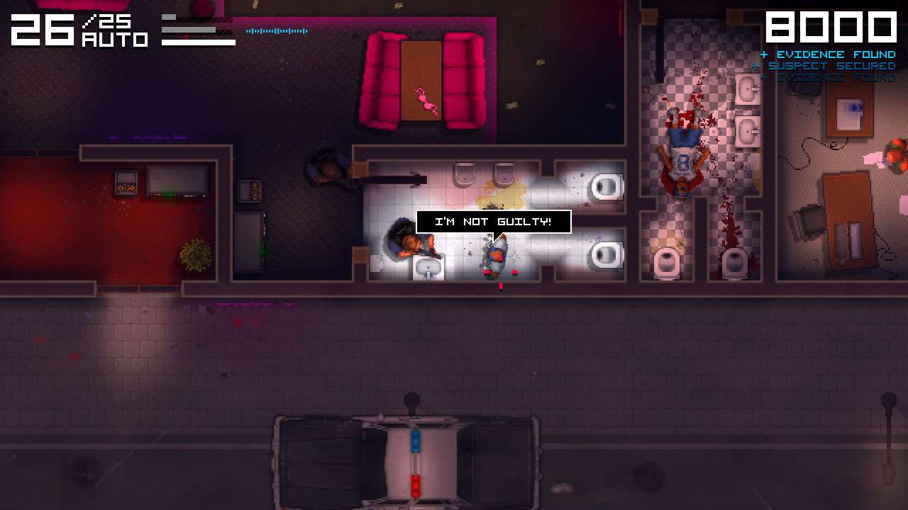 Давайте вспомним, как мы играли в эталонную для жанра Hotline Miami. Врывались и укладывали к чертям всех, кто подавал признаки жизни. Но в Police Stories это недопустимо. Мы ведь не маньяки и садисты, а стражи правопорядка. Даже если перед героями появляется темнокожий бугай с УЗИ, сразу же делать из него дуршлаг нельзя. Действуем по протоколу: сначала безумно орём, чтобы он положил ствол и сдался. Не слушается? Бьём прикладом в нос! Проявляет агрессию и пытается целиться? Только в этом случае открываем огонь. Ещё одна креативная схема: пропускаем громкое приветствие и сразу заряжаем рукояткой автомата по наглой физиономии. От такого приёма любой противник покорно откинет оружие и встанет на колени, умоляя больше не пересчитывать ему зубы ударами. Эта тайная полицейская техника работает на всех, даже на гражданских, ведь они порой начинают огрызаться, не желая сразу принять безопасную позу с удержанием рук за головой.