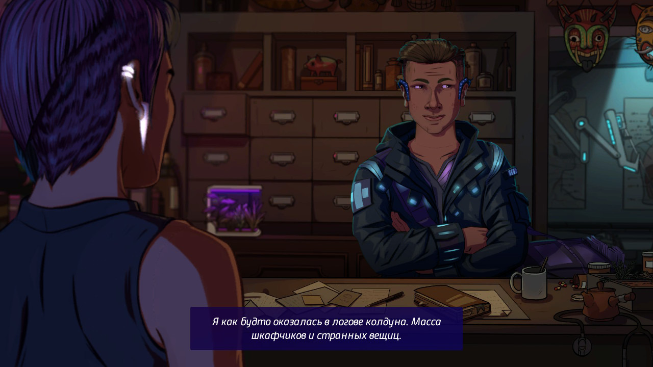 У Neo Cab вполне четкий стиль: обилие сине-фиолетовых тонов, футуристический антураж и герои, вызывающие ассоциации с годами, когда маленькие flash-игры были очень популярны. Хотя, может быть, кому-то они навеют мысли об отечественной мультипликации. В общем, там, где не получилось взять эффектностью, пришлось прибегнуть к трюкам. И если модель подачи эмоций вытащил «филгрид», то атмосферу игры спасла не картинка и размеренная манера повествования, а саундтрек в виде электронщины и эмбиентов.