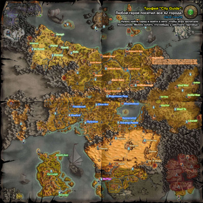 Карта , где обозначены только города нужные для трофея. В любом графическом редакторе (например Paint) можно зачеркивать. Нужно не просто найти город, но и войти в него. Таким действием игра засчитывает посещение. Можно купить (продать) что-нибудь у местного торговца.