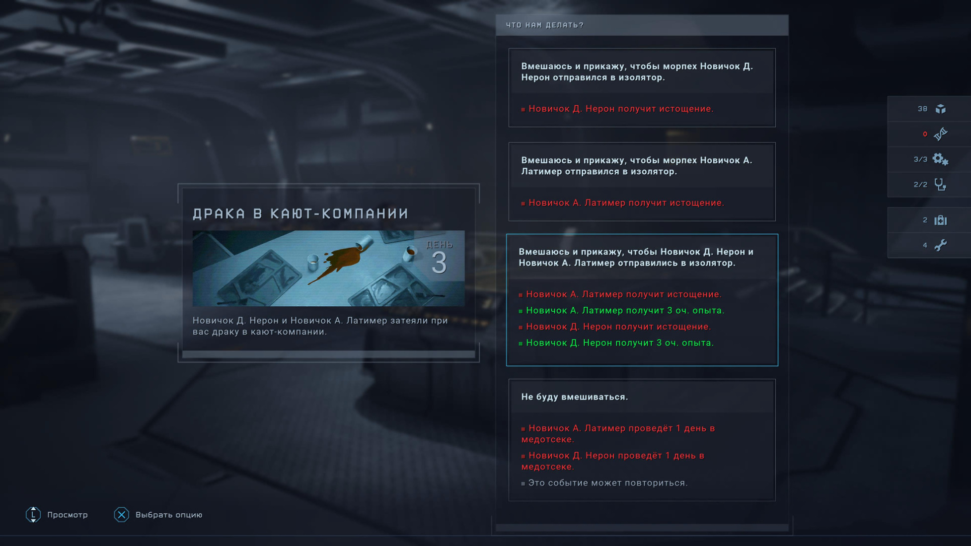 Ограниченность ресурсов сильно усложняет выполнение поставленных задач. Для совершения практически любого действия требуются командные очки, которые со временем восстанавливаются. Зачастую приходится выбирать – заварить дверь и немного передохнуть или отремонтировать сломанную турель, повысив тем самым боевую мощь здесь и сейчас. Передвижение противников можно отслеживать на карте, предварительно установив сканер местности. Сверяясь с картой, бойцы должны выбирать оптимальные маршруты, максимально избегая стычек с врагом. Каждый раз при обнаружении отряда противником начинает действовать статус «в розыске», во время которого враги ведут себя более агрессивно, шкала стресса растёт, и ксеноморфы активно ползают по карте в поисках добычи. Чем выше уровень тревоги, тем суровее становятся волны чужих. На первом уровне противники появляются небольшими группами по 3-5 особей. На втором – возникает счётчик, предупреждающий, что в течении минуты прибудет волна чужих в количестве 10-15 штук, с которыми уже не получится справиться без заранее установленных турелей и мин-ловушек. На третьем – к бою подключается рандомный мини-босс, а учитывая, что рядом шныряют рядовые ксеноморфы, отбиться от него уже не представляется возможным. Лучшая тактика в Dark Descent – устранять противников максимально тихо и незаметно, а если запахло жареным, то экстренно эвакуироваться и вернуться к выполнению задач на следующий день (счётчик агрессивности сбрасывается при каждом новой рейде). В перерывах между вылазками предстоит решать непростые задачки вроде улаживания конфликтов между обитателями корабля или принятия решения об организации спасательной миссии, которая позволит увеличить штат инженеров или медиков. В последнем случае десантирование на планету в день операции придётся пропустить. Однако не стоит долго сидеть на базе, ведь с каждым днём растёт уровень заражения планеты и врагов становится всё больше.