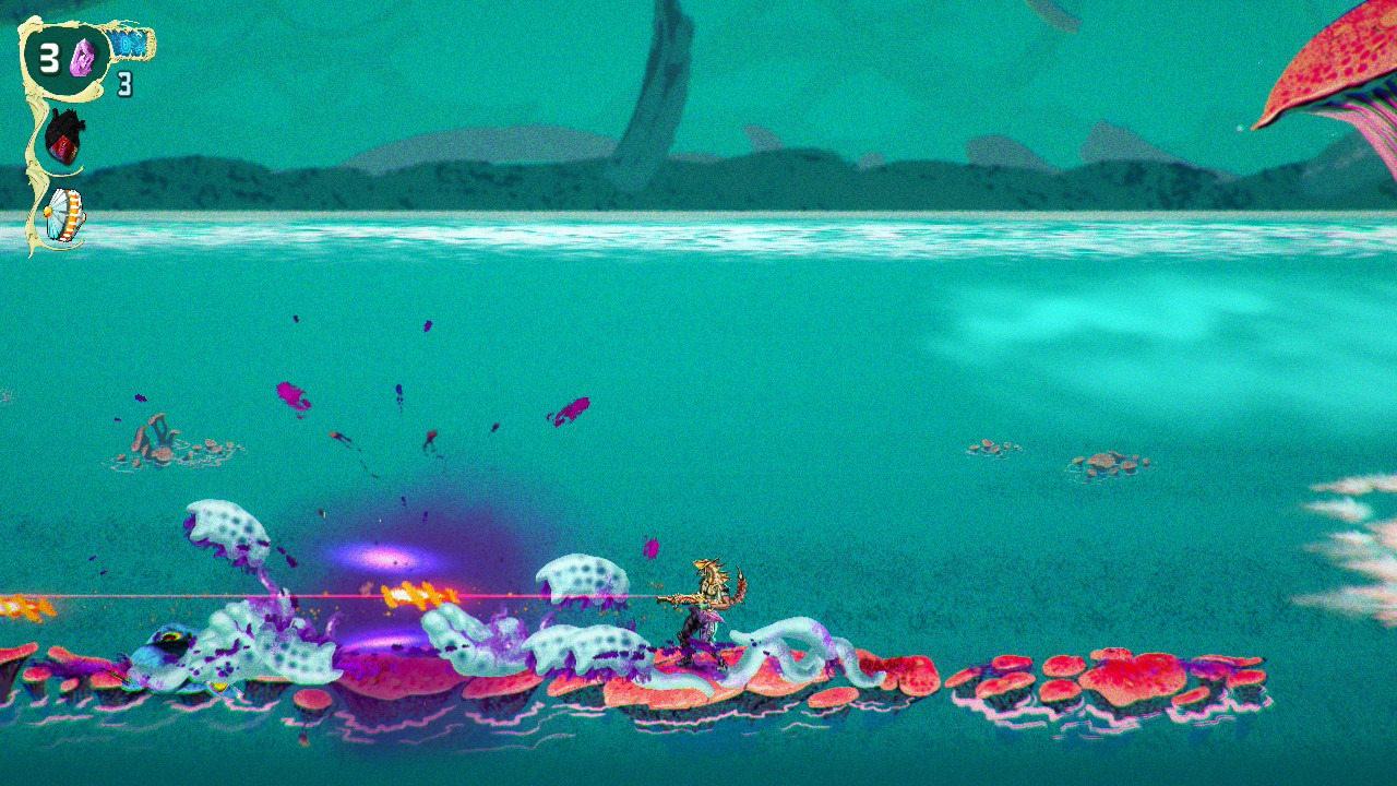 Но всё это мелочи. Главная причина обратить внимание на игру — её геймплей. Основа на первый взгляд проста: герой бегает, стреляет, прыгает, цепляется за поверхности и сражается с толпами врагов. Кажется, будто перед нами банальный боевичок в духе Contra и прочих аналогов, однако цепной посох, вынесенный в название, превращает привычный набор действий в куда более увлекательное процесс. Его можно метать как копьё, использовать как щит от снарядов, втыкать в поверхности (или даже во врагов), чтобы получить временную платформу, или применять как крюк-кошку для стремительного перемещения по локациям. И самое главное — всё это действительно необходимо.