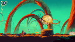 Следующий момент — боссы, которых я бы назвал самой яркой частью игры. Дело в том, что здесь они представлены не в виде стандартных "губок для поглощения урона", а как полноценные постановочные сражения, заставляющие по полной использовать механики посоха, особенности арены и слабости противника. В одних случаях нужно цепляться за гигантское чудовище, в других — вытаскивать уязвимые внутренности, в третьих — грамотно комбинировать платформинг и стрельбу под постоянным давлением. Такие бои действительно запоминаются и выгодно выделяются на фоне большинства рядовых стычек, которые в основном проходят относительно спокойно.