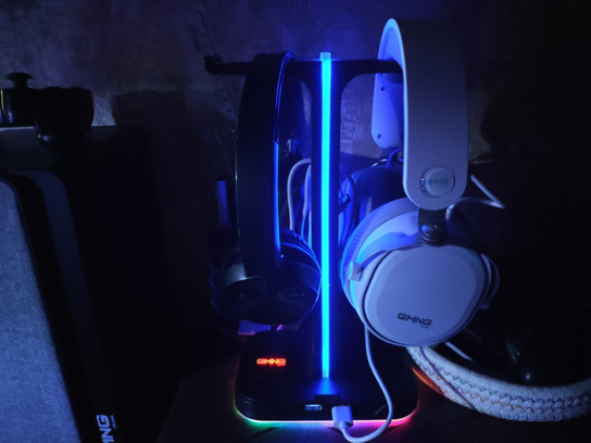 В общем-то, конструкция вполне стандартная: плоская колонна на такой же плоской подставке с двумя выпирающими «рожками» для размещения двух гарнитур одновременно. Поверхность выполнена из матового пластика со встроенными светодиодами по краям основания, а также вдоль вертикальной колонны. Светодиоды регулируются двумя отдельными переключателями. Те, что у основания, могут предложить 6 режимов подсветки с возможностью её отключения. Синяя диодная полоса вдоль колонны не предусматривает каких-либо других режимов, поэтому ее можно лишь включить или выключить. Поверх ножки также нанесен светящийся красным цветом логотип GMNG, который и вовсе никак не регулируется. Странное, но не особо критичное решение.
