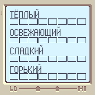 Текстовый гайд (en) с таблицами с цифровыми значениями по теплоте, свежести, сладости и горькости каждого напитка, а так же каждого ингредиента в отдельности по степени добавления, что сильно помогает в подборе сложных напитков с 30 до 50.