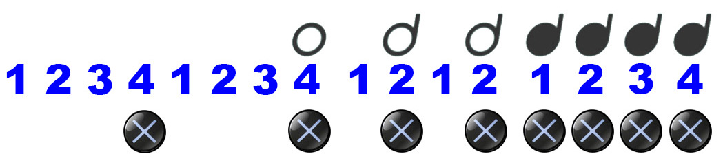 , когда она указано под цифрой. Ваша цель поймать бит и попадать кнопкой точно в такт биения метронома. Если правильно синхронизировать отсчет цифр с ритмом на индикаторе, то после правильного нажатия кнопки в углу экрана будут появляется указные ноты. Если нота не появилась или появилась другая, то ритм сбит и надо начинать сначала все комбо. Главная проблема этого комбо это сыграть именно последнюю целую ноту!