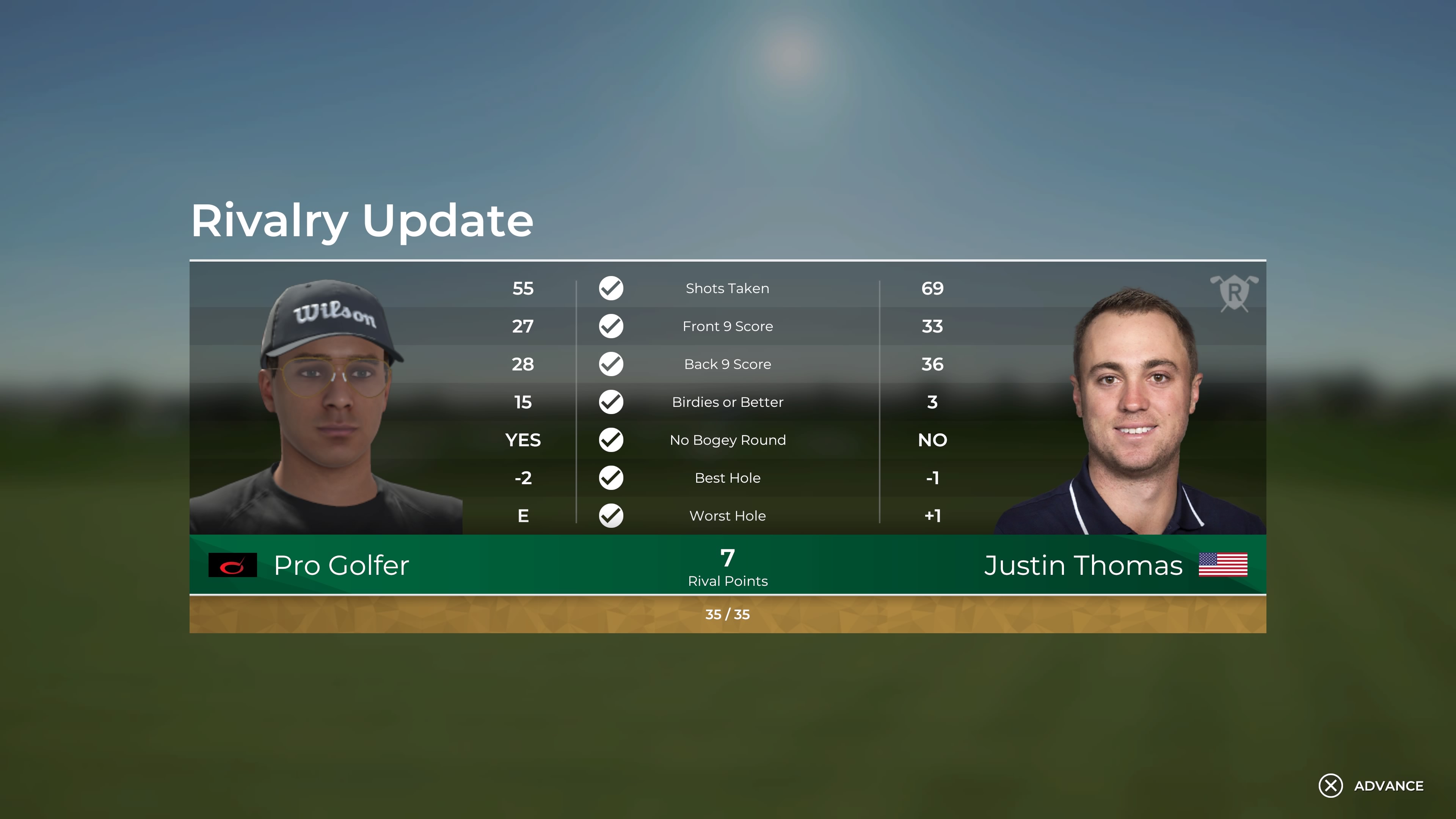 Рекомендуется играть в режиме PGA Tour, где каждый турнир это 18 лунок. В общем 33 турнира за сезон + дополнительные альтернативные турниры. За турнир можно получить 7 очков. Для победы над последним соперником потребуется 35 очков.