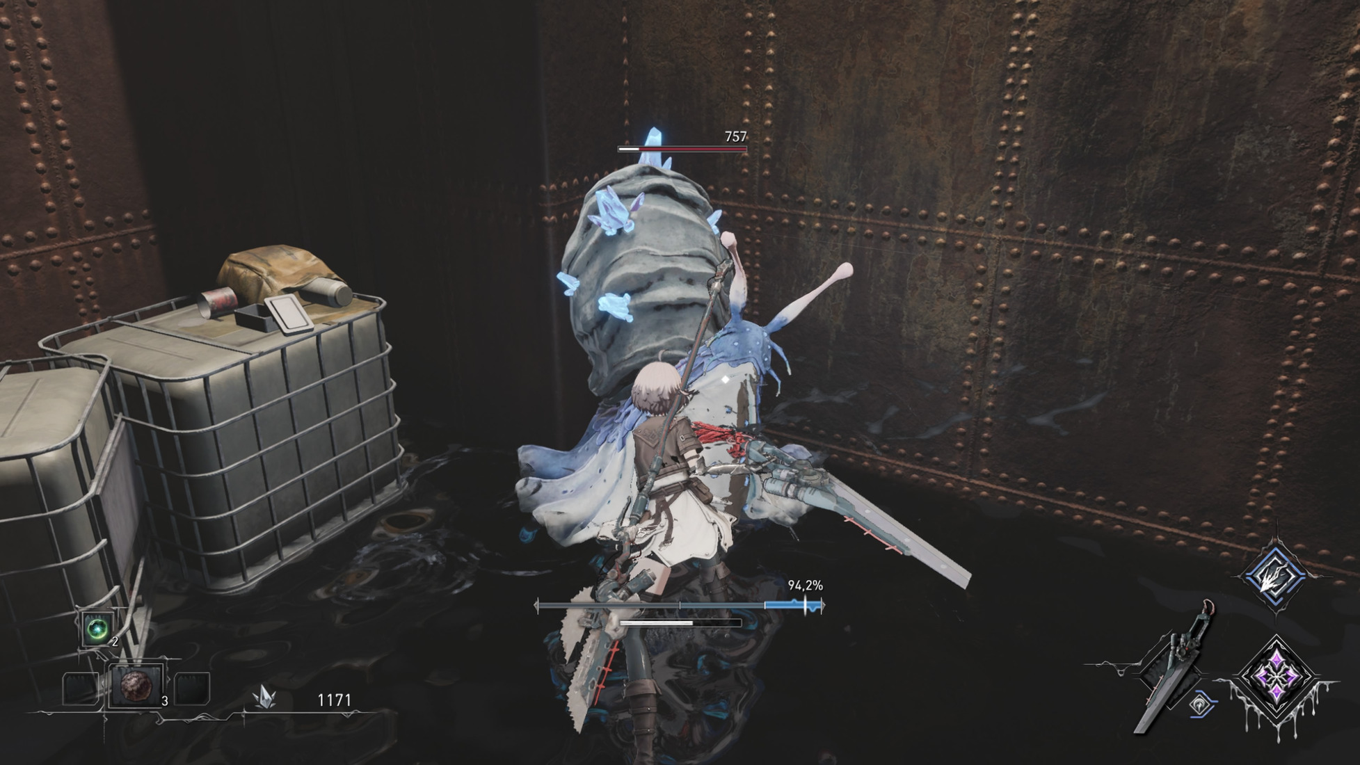 Последний нюанс — система синхронизации, представленная в виде процентной шкалы, разделённой на сегменты разных цветов. Работает она предельно просто: пропустили атаку — потеряли очки, нанесли несколько ударов по врагу — получили. Высокий уровень синхронизации даёт пассивный прирост к характеристикам и урону, тогда как низкий вводит Аррису в лёгкое подобие стана и ослабляет её. Главная особенность в том, что полоска расходуется на все дополнительные действия, включая и местную магию. Поэтому игроку приходится учитывать состояние шкалы и выбирать, что нужнее в конкретный момент: совершить электрический рывок, применить заклинание или попытаться отвести смертельный выпад.