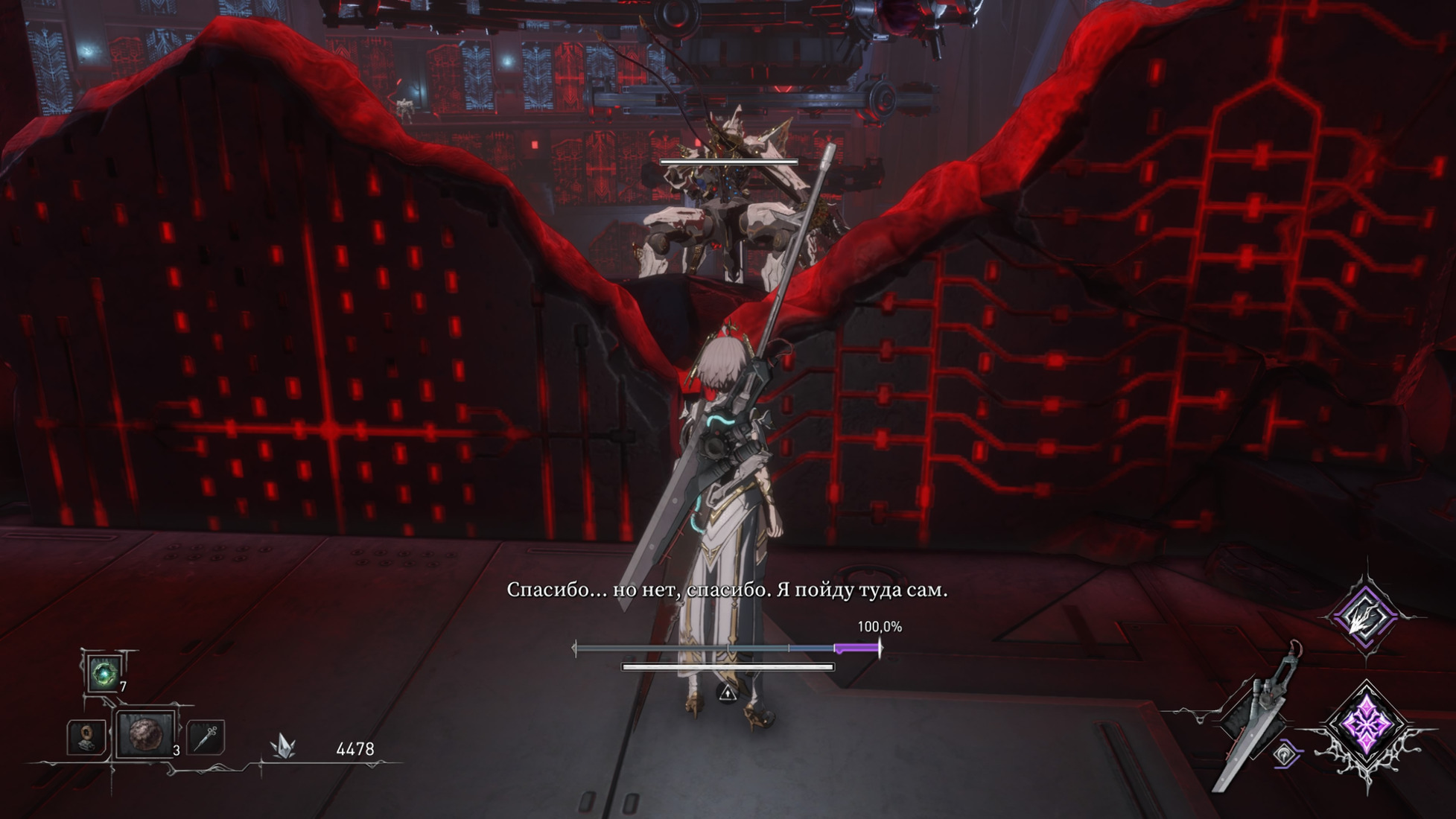 Далее — сложность. Все мы привыкли к тому, что соулслайки не прощают ошибок. AI Limit — исключение из правил, и именно поэтому её можно смело назвать отличной игрой для знакомства с жанром. Отсутствие шкалы выносливости здесь только в плюс. Важно, что разработчики не навязывают конкретный стиль прохождения. Не любите парирование — можно обойтись без него. Щита и стандартных уклонений с лихвой хватит для большинства ситуаций. То же самое касается и выбора оружия: различия между клинками одного класса (мечи, копья и т.д.) минимальны, так что пройти игру с начальным вооружением вполне реально. Что до сложности боёв, то ближайшим аналогом я бы назвал The Surge 2. Умереть при наличии хотя бы базового опыта и понимания принципов поджанра практически невозможно. Единственное исключение — два босса, способные быстро поставить на колени поверившего в себя игрока. С остальными главгадами трудностей не возникает и вовсе: к их паттернам быстро привыкаешь, и злодеи падают максимум после пары попыток.