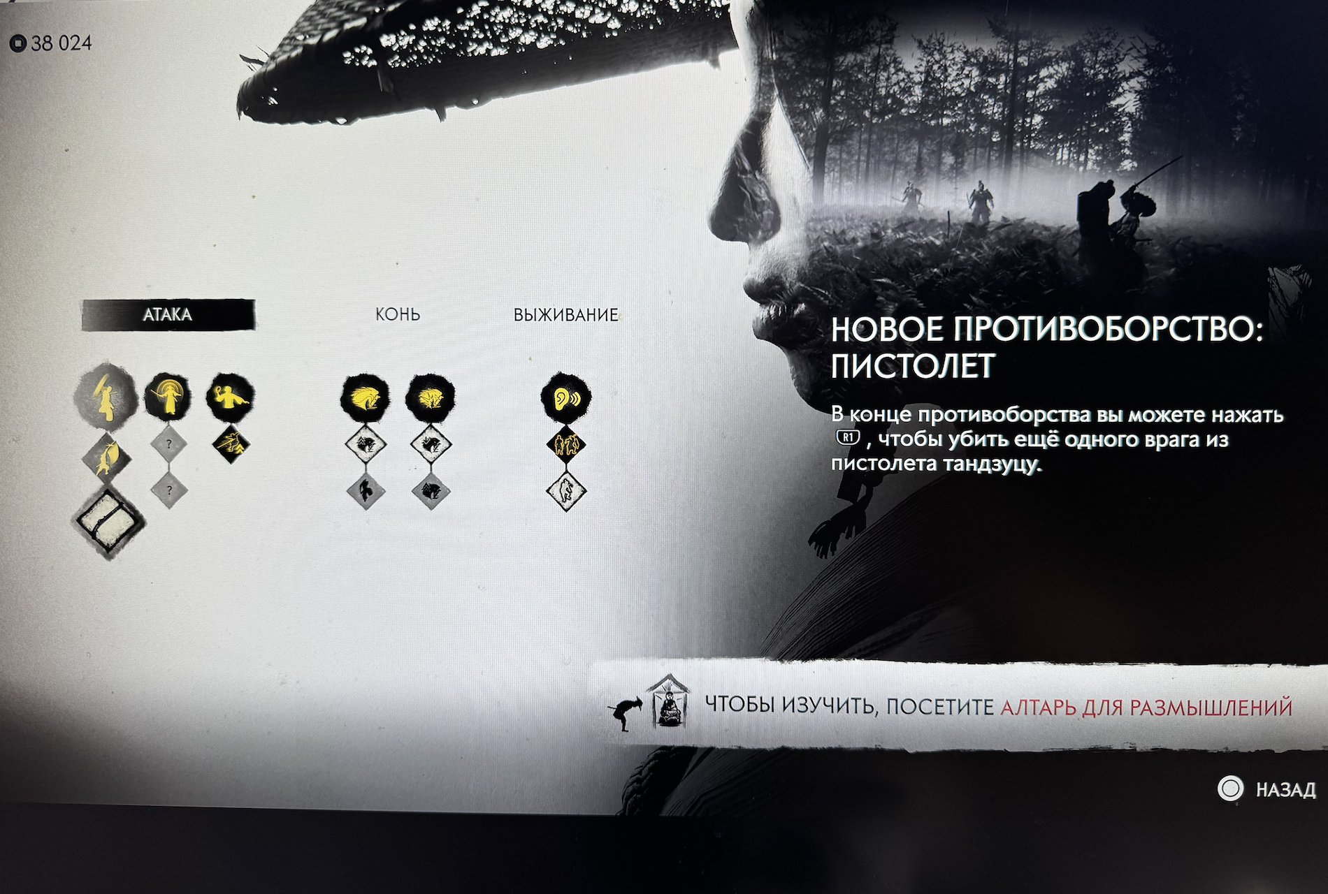 пройдите квест на получение пистолета до того, как почистите все лагеря шести изгоев, иначе окажитесь в ситуации, в какой оказался я - долго бегал по карте, чтобы найти рандомных противников, на которых можно использовать противоборство . Тогда снимайте оберег Хатимана, чтобы убить двух, а третьего пристрелить, иначе просто перебьете всех катаной. в самой последней миссии будет еще шанс заработать трофей.