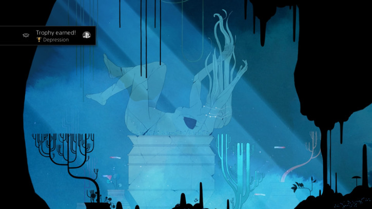 На открытой местности, где находится панцирь черепахи, плывите вниз, пока не доберетесь до темного участка. Затем проплывите вдоль левой стены, и вы увидите слева от себя несколько синих точек, похожих на траву. Зайдите в это отверстие, и вы увидите статую. Подплывите к центру статуи, и появится трофей.