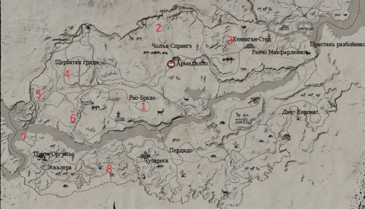 Костюм Маршала США - Не переживайте и не торопитесь, времени предостаточно. Необходимо зачистить только 5 логов с карты ниже (под номерами 3, 2, 4, 5, 1 - я проходила именно в таком порядке). Логово № 6 на Соломонз-Фолли и №7 и 8 в Мексике для костюма не нужны. При зачистке логов я умудрилась трижды умереть и все равно уложилась во времени. Если не выполните дополнительные задания (спасти НПС из лагеря), то лагерь все равно засчитается. Единственное, наверное, все же, не стоит использовать быстрые перемещения между лагерями. Я скакала на лошади по проложенному маршруту по дороге. В целом здесь вообще нет ничего сложного.