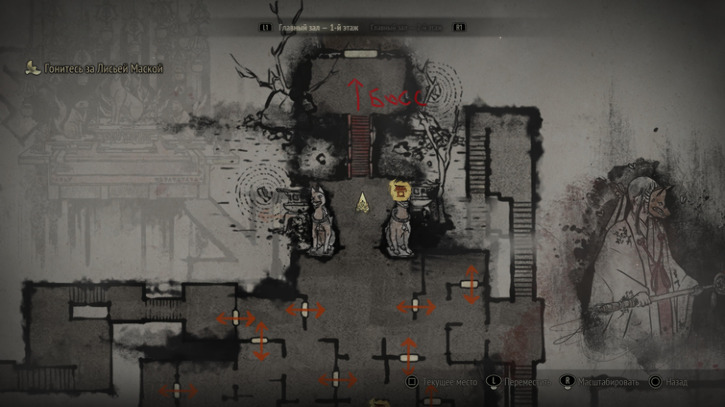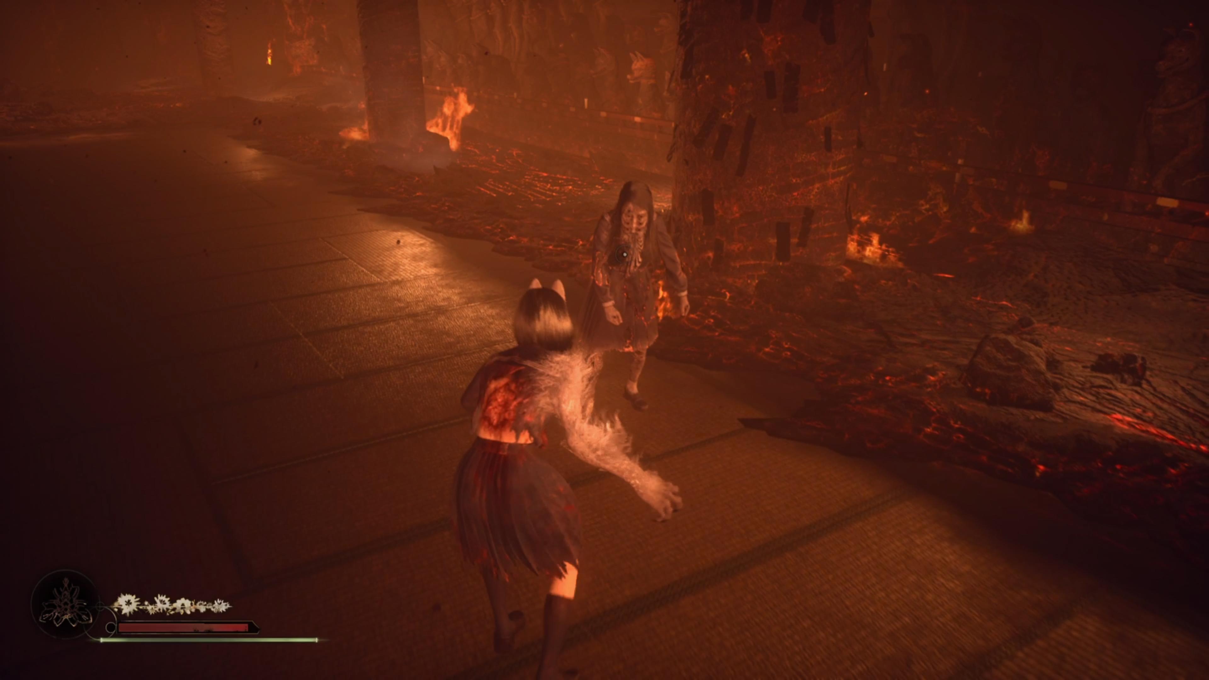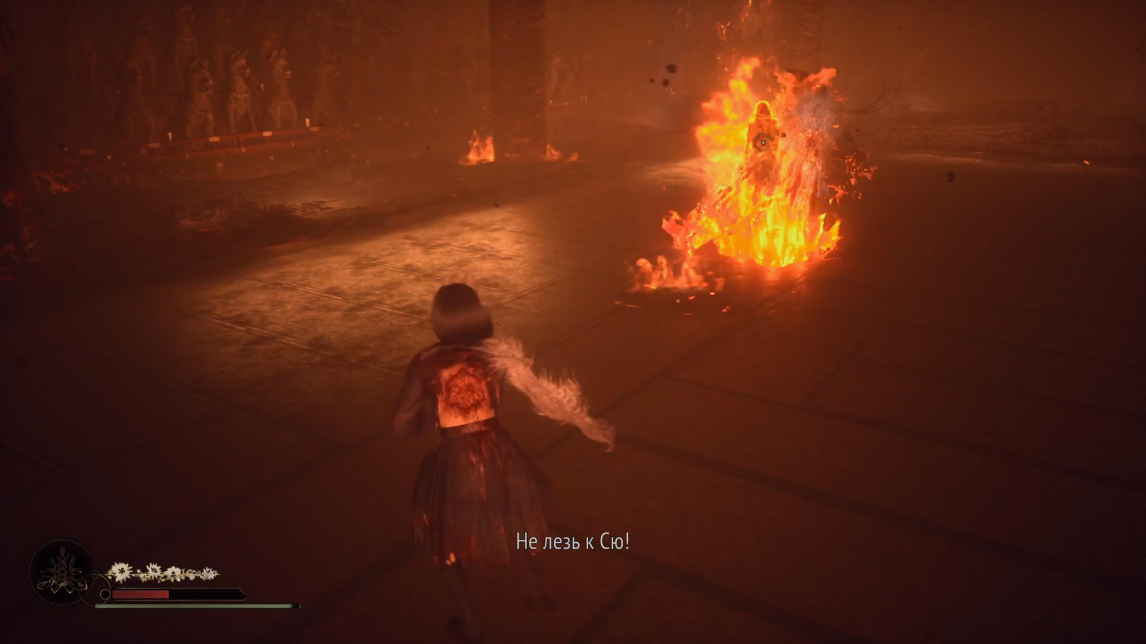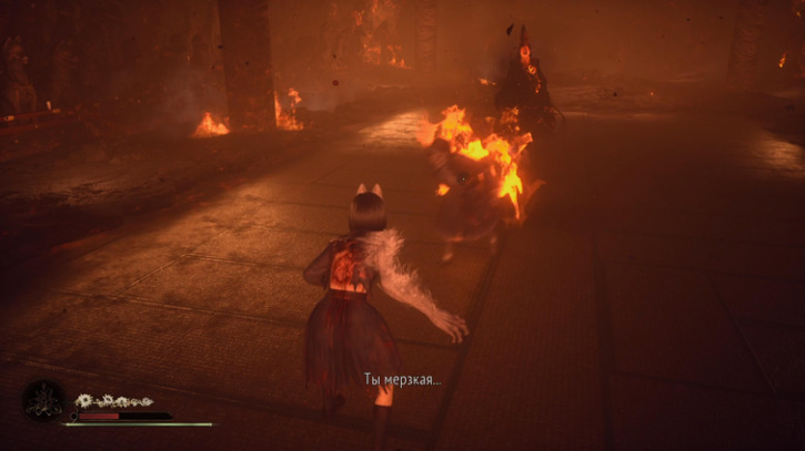 В конце локации альтер. мира "Главный Холл" (там где нужно завершить 3 ритуала). Босс кидается сгустками огня и призывает столбы из земли. Периодически вокруг будут появляться куклы. Сперва они идут оч медленно особой угрозы не представляют чтоб их вынести, но надо следить, они могут зареспаунится за спиной. Им хватает пары обычных ударов, лучше сразу их выносить, босс будет кидать в них огнем, или случайно если их заденет теми же огненными столбами, они загорятся и начнут бежать к вам и взорвуться при приближении, тут только уклоняться. От самого босса соответственно урон получать можно.