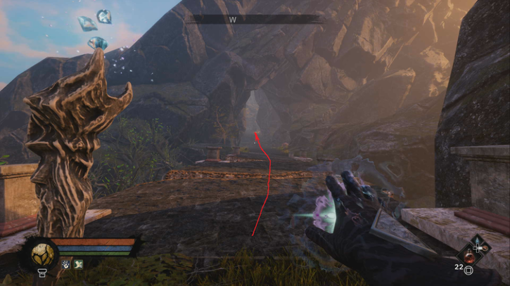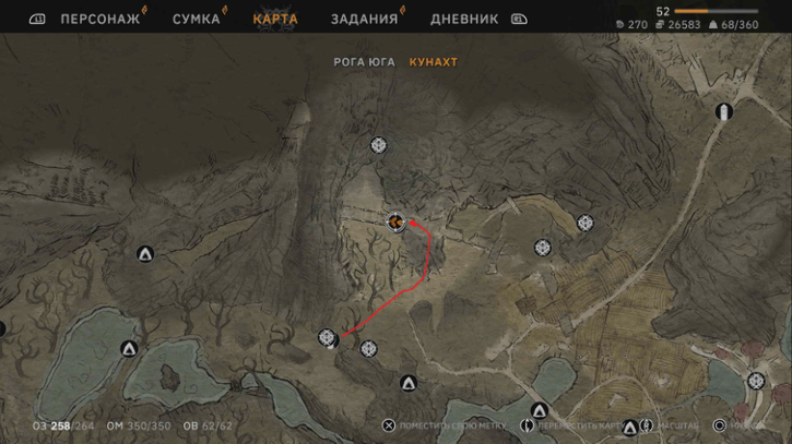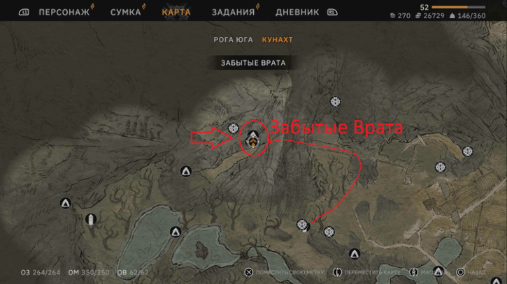 После прохождения сюжета Кунахта и получение "щита" Паламеда, отправляемся на телепорт Болота, оттуда идем, как показано на скриншоте, переходим мост и, после битвы с жабоглотом и зачистки лагеря дезертиров, оказывается около входа в Забытые врата. Открываем, заходим, внутри будет драка с босом (довольно сильный, приготовьтесь), после чего будут последовательно два диалога с двумя НПС. После окончания второго диалога трофей выпадет.