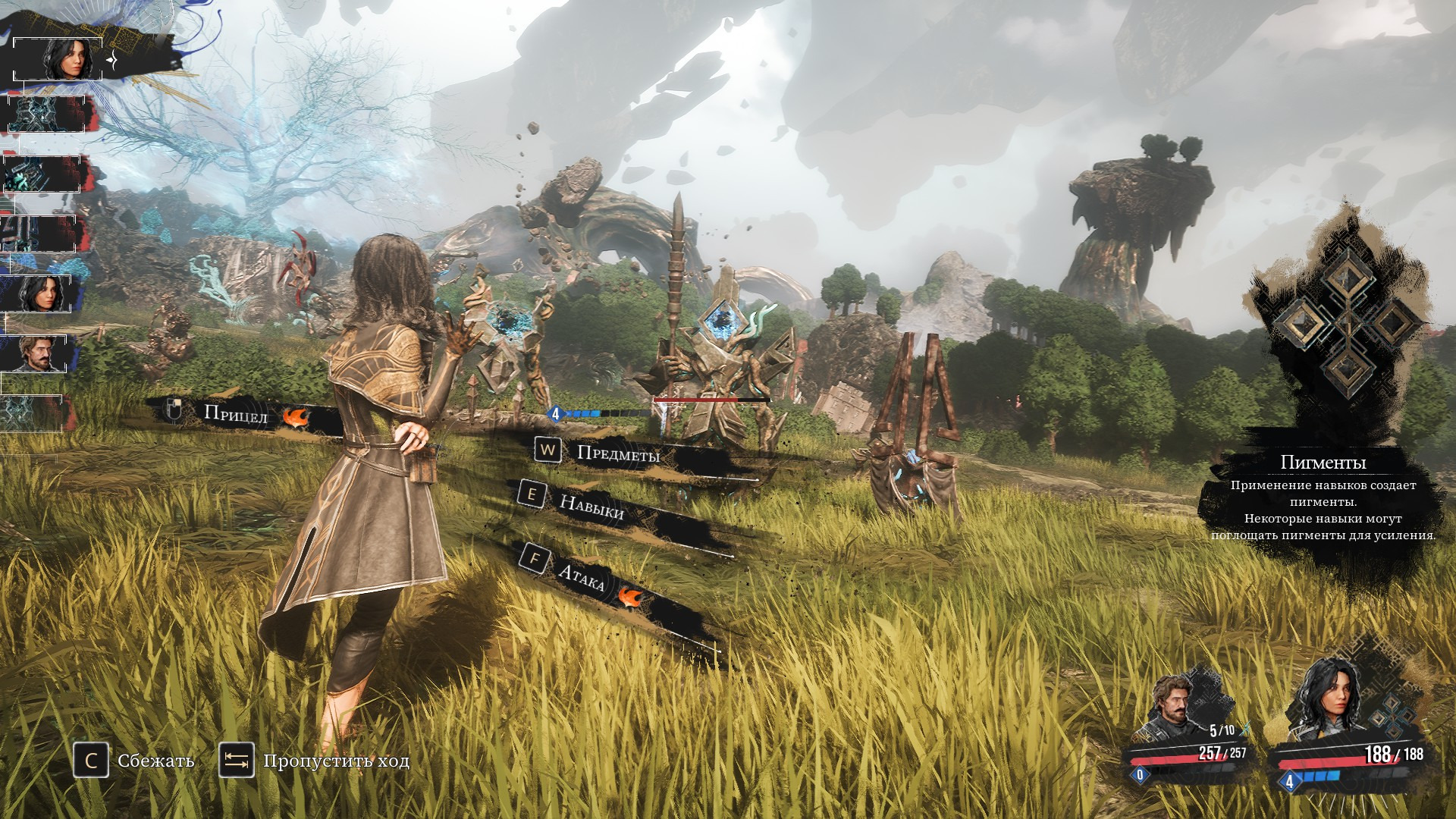 Но и на этом не заканчивается рассказ о сражениях. Еще игра предлагает маленькую, но разнообразную команду героев со всевозможными трюками. Гюстав, пожалуй, самый прямолинейный: сначала копит заряд, а потом со всей дури бабахает протезом руки. Грубовато, зато мощно, еще и мозги врагам встряхивает. Возьмем для контраста рыжую фехтовальщицу Маэль, которая при использовании способностей меняет стойки: в атакующей бьет больнее, правда, и урона получает больше, а в защитной — лучше держит удары, вдобавок получает очки действия за успешное уклонение. Более того, ее способности получают дополнительные эффекты, если использовать их в определенной стойке. Так что при толковом чередовании трюков можно доставлять врагам массу неприятностей. И это только пара примеров, у прочих персонажей хватает своих фокусов.