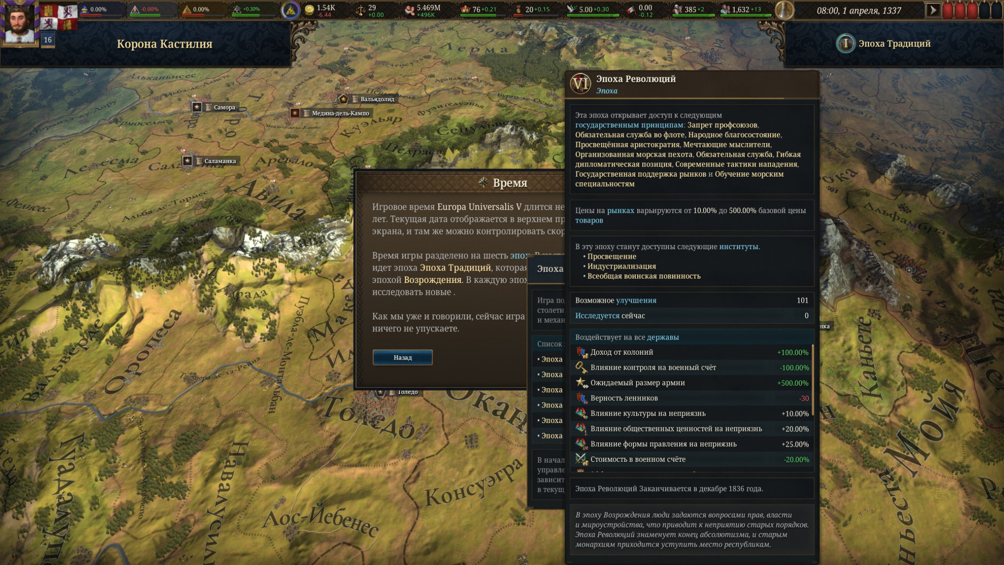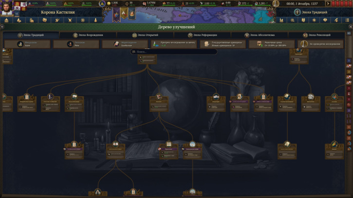 Последнее крупное изменение — система прогресса, почти аналогичная той, что мы видели в Victoria 3. Теперь темпы развития зависят от грамотности населения, благосостояния, структуры общества и выбранного национального фокуса эпохи. Технологическое древо действительно стало древом — широким, с “ветвями” достижений и реформ, которые меняют не цифры и модификаторы, а само устройство государства: от книгопечатания и металлургии до профессионализации армии и появления кабинета министров. Ощущение течения времени — от позднего Средневековья к ранней современности — достигается не за счёт классических скриптов (хотя без них не обошлось), а благодаря естественной логике прогресса. Каждая эпоха открывает доступ к новым институтам и улучшениям, но с одним важным нюансом: они зарождаются там, где были исторически. Поэтому, прежде чем идти в ногу со временем, придётся потратить немало сил и ресурсов, чтобы привлечь новаторов и внедрить их идеи внутри своей страны.