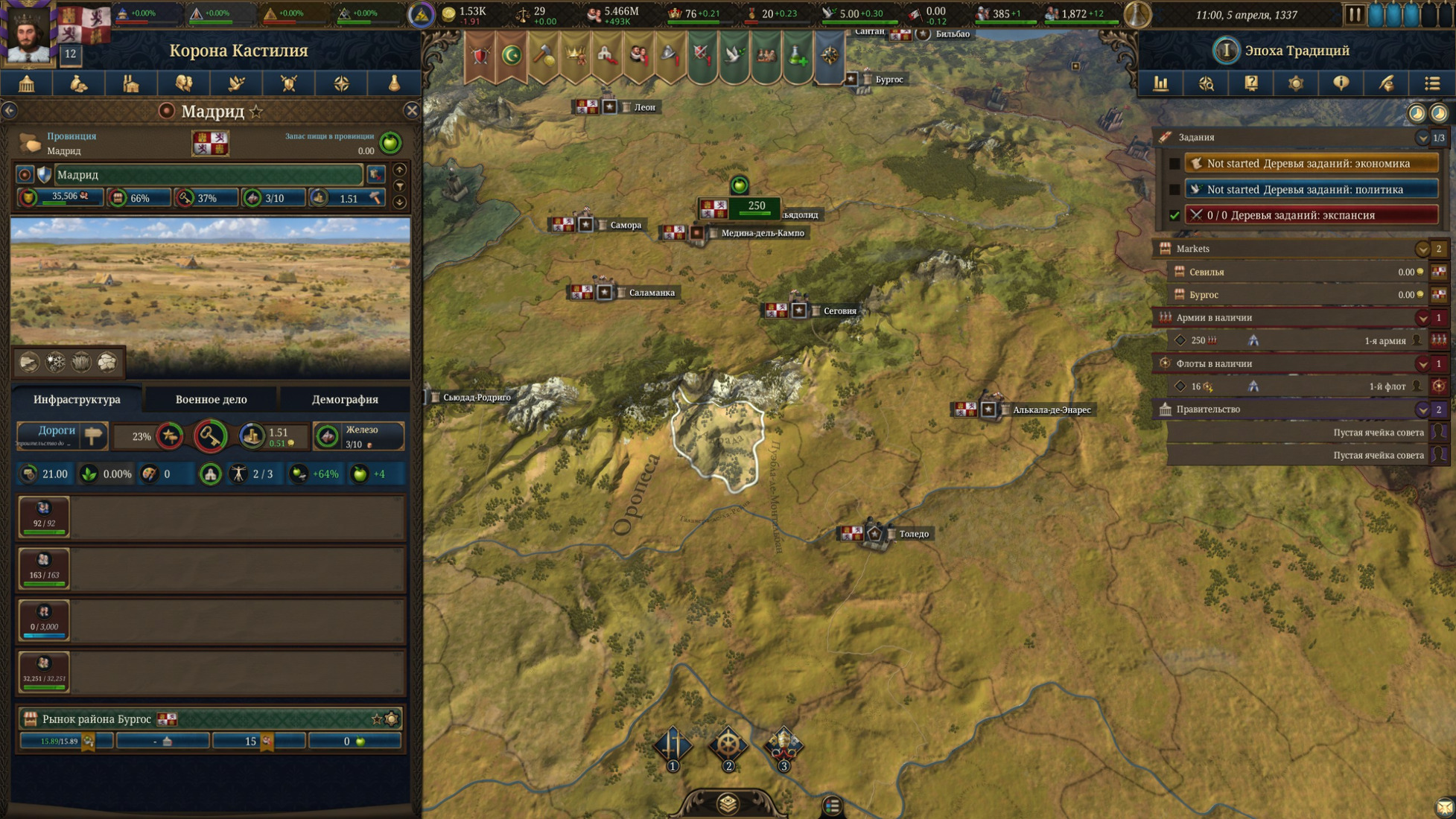 Теперь о геймплее. В его основе мало что изменилось: от нас, как от правителя, по-прежнему требуется скрупулёзный микроменеджмент, при котором каждое действие запускает цепочку самых разных последствий. Основная цель — провести государство сквозь пять столетий и шесть эпох. В зависимости от выбранной стартовой нации будет отличаться и стиль управления. К примеру, Неаполь сосредоточен на внутренних проблемах и политике, Венгрия погрязла в экономике соседних регионов, а путь Османов и Кастилии связан с постоянными войнами, экспансией и борьбой за влияние. Плохого пути здесь нет — игра старается следовать реальной истории, но охотно отклоняется от канона и идёт по альтернативным путям развития. Главный совет прост: не бойтесь ошибок. Первые часы здесь нужны, чтобы разобраться в меню, свыкнуться с механиками и ощутить масштаб происходящего.