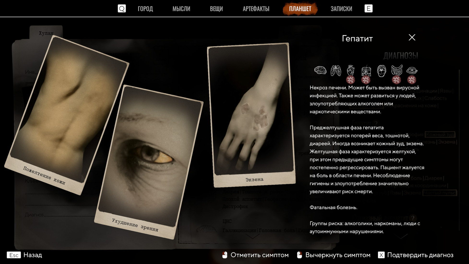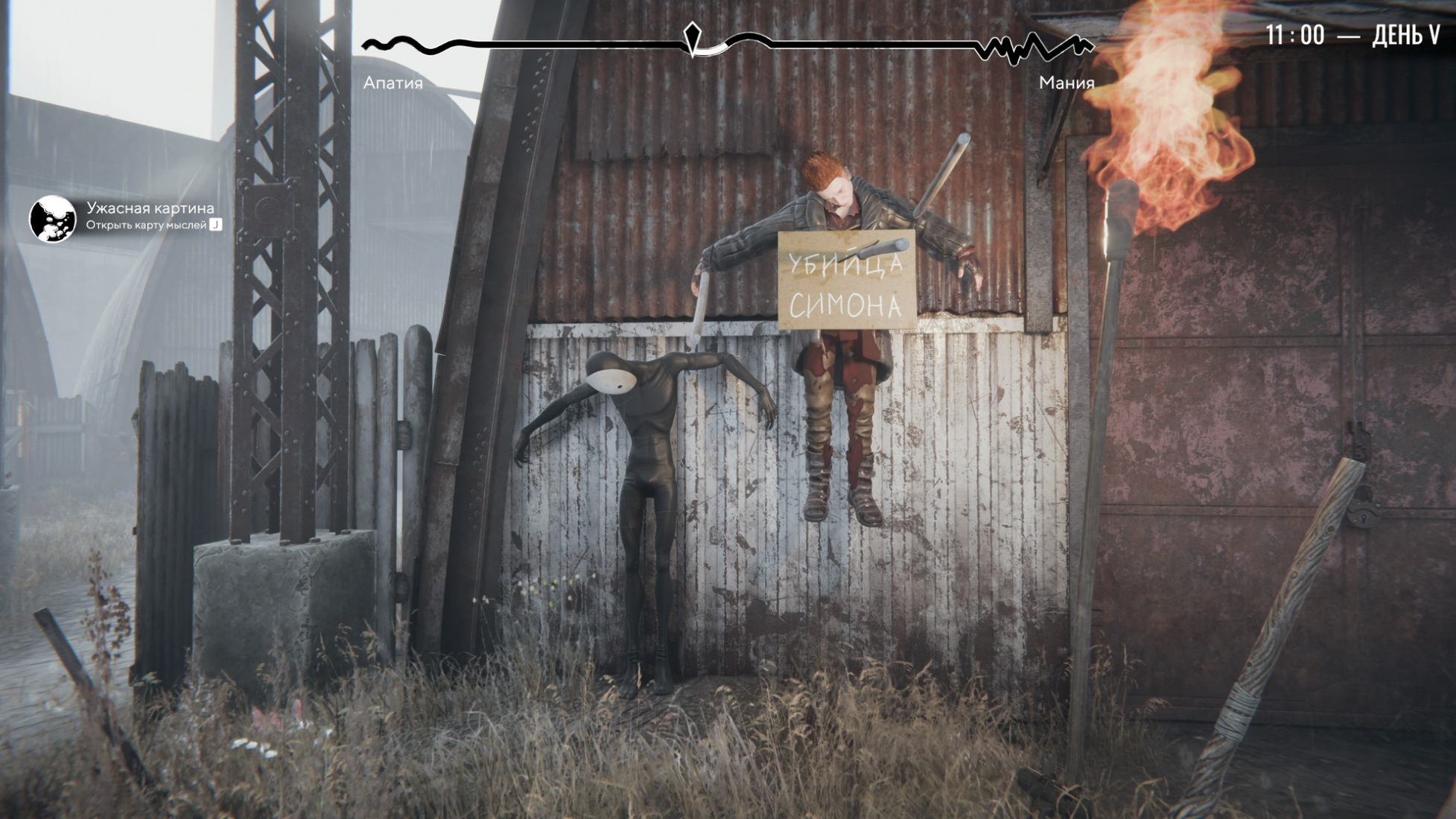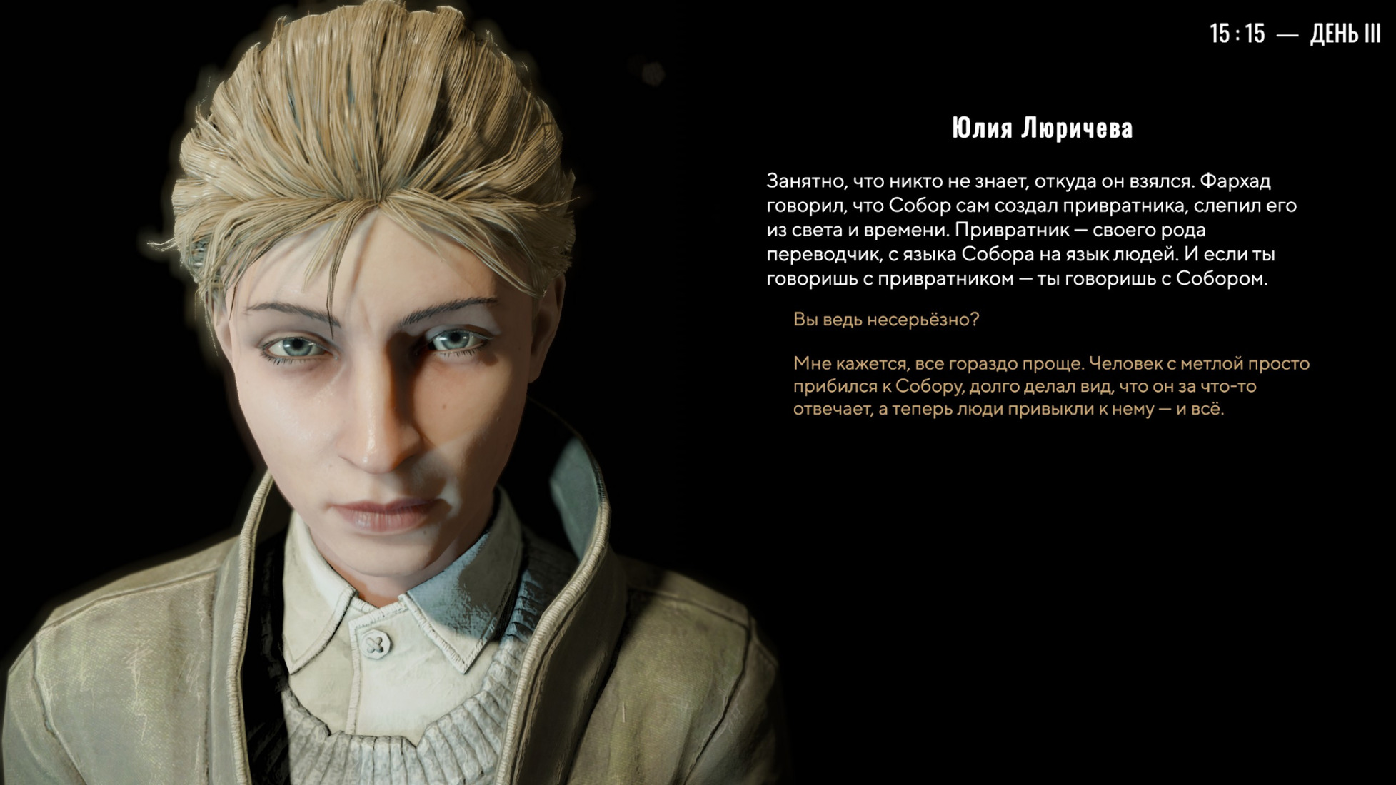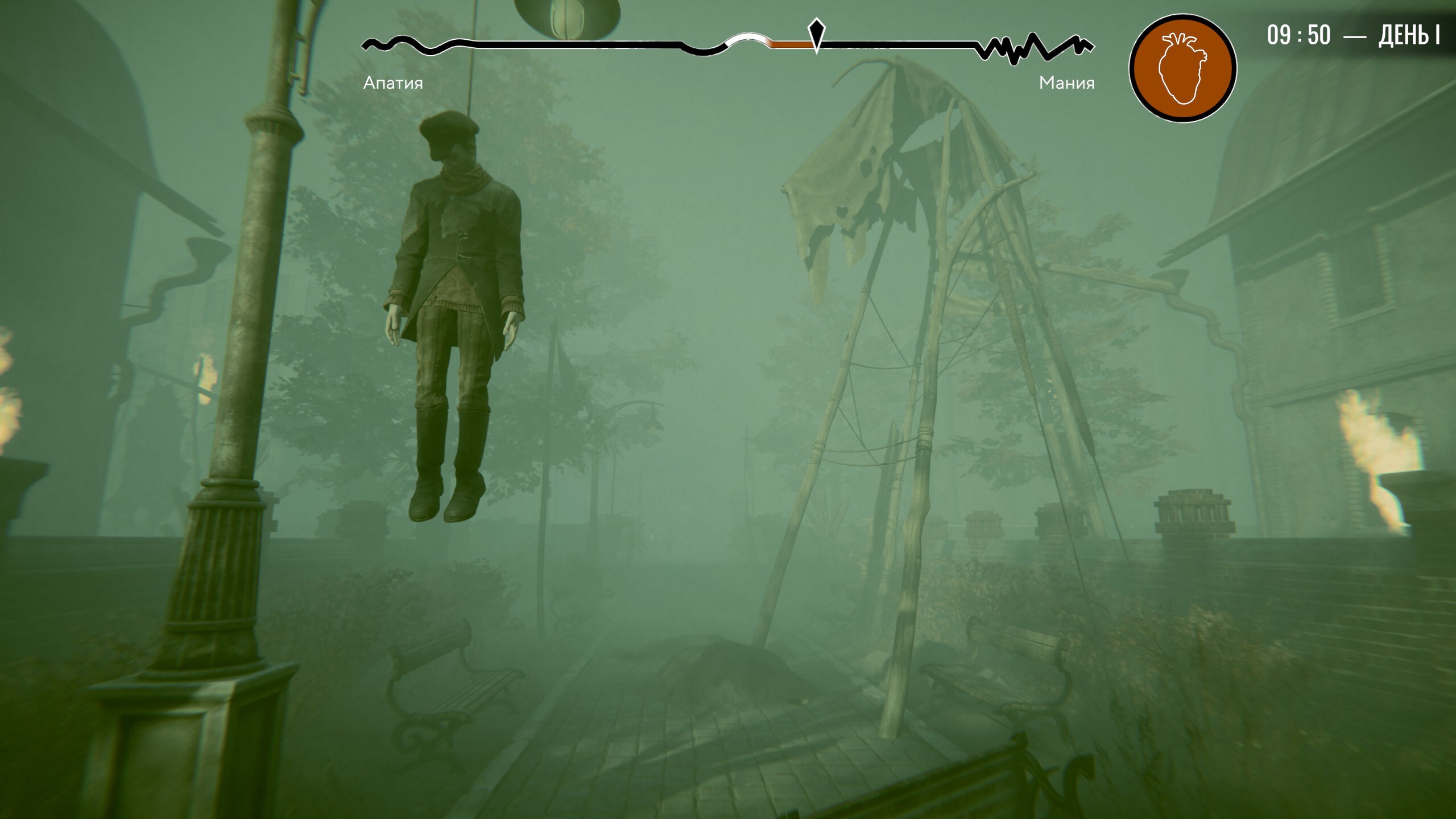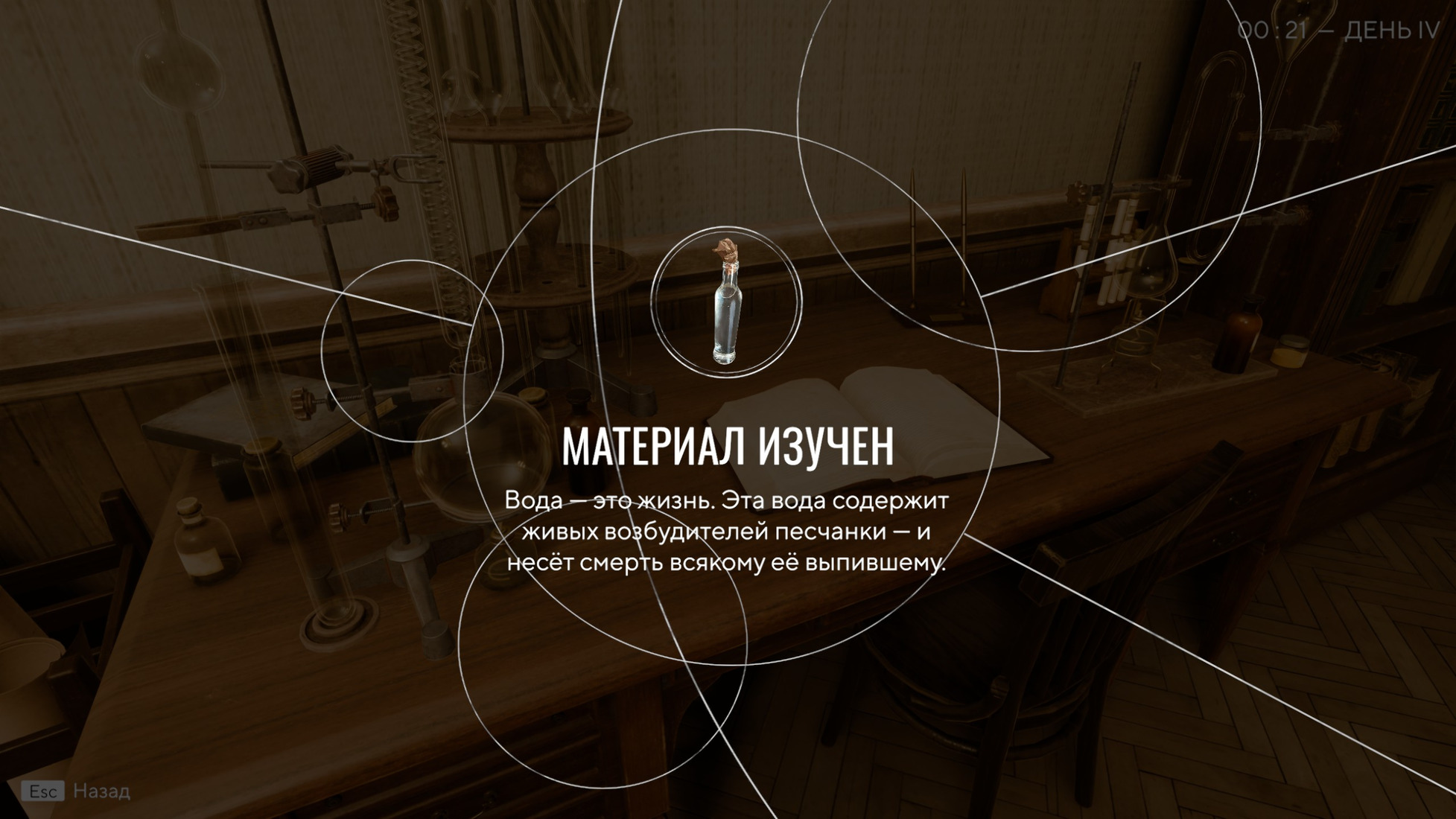 Двенадцать дней здесь — не просто условный счётчик, отсчитывающий секунды до уничтожения города, а полноценные экосистемы, между которыми можно перемещаться. Каждое решение оставляет след, а сами сутки становятся точкой входа в цепочку причин и последствий. Допустим, впервые попав в пятый день, мы узнаём, что тело убитого Исидора было захоронено почти сразу после нашего приезда, его кабинет оказался заперт изнутри, а сам Данковский угодил в тюрьму за попытку побега накануне ночью. Только вот как изменится повествование, если вернуться назад, осмотреть тело заранее и открыть кабинет до того, как события зайдут в тупик? Или переместиться в четвёртый день, но не заходить в тот самый вагон-ловушку, а поговорить с дружинниками и выдать людей, прячущихся в нём? Но, быть может, стоит отмотать происходящее ещё дальше? И вернуться в третий день, чтобы там заключить сделку с некой Юлией и в обмен на попытку помощи получить наводку на машиниста и понимание того, как с ним стоит разговаривать. Самое интересное, что игра постоянно вставляет палки в колёса, намеренно мешая любому выстроенному плану. В качестве примера можно привести Станислава Рубина. Спасли его от пожара — на следующий день бедолага получает пулю в голову. Сумели отвести убийц — его заживо закапывают в землю. Не нашли лопату и не успели выкопать — он задыхается, и добро пожаловать на второй круг. Из более приземлённых ситуаций отмечу пересмотр лечения больных, если ранее мы ошиблись и кто-то из них умер из-за неправильно поставленного диагноза. И да, привычного дневника здесь нет. Вместо него — мысли, связывающие события всех прошлых дней в единую паутину. А как эта история продолжит развиваться дальше, зависит уже только от нас.