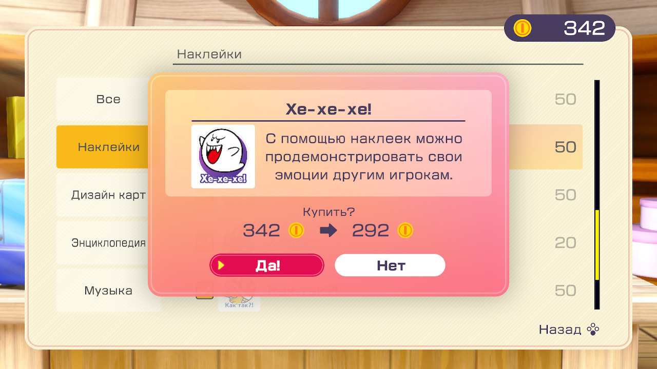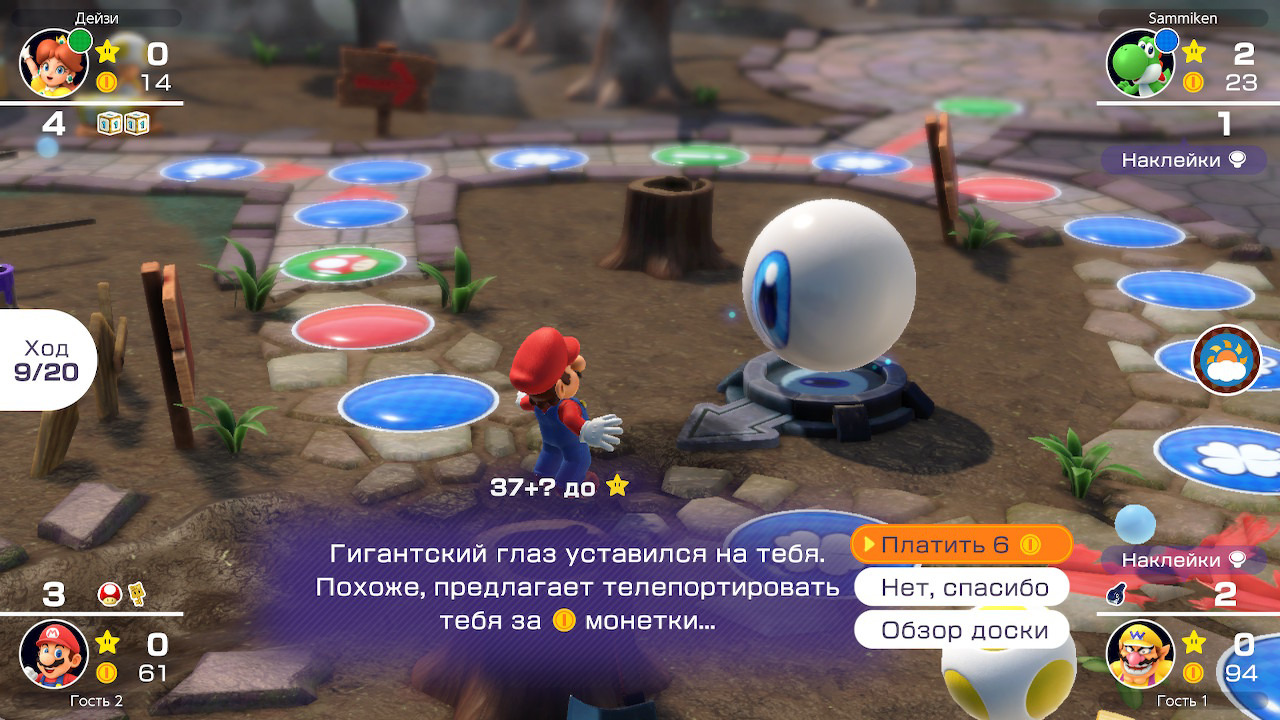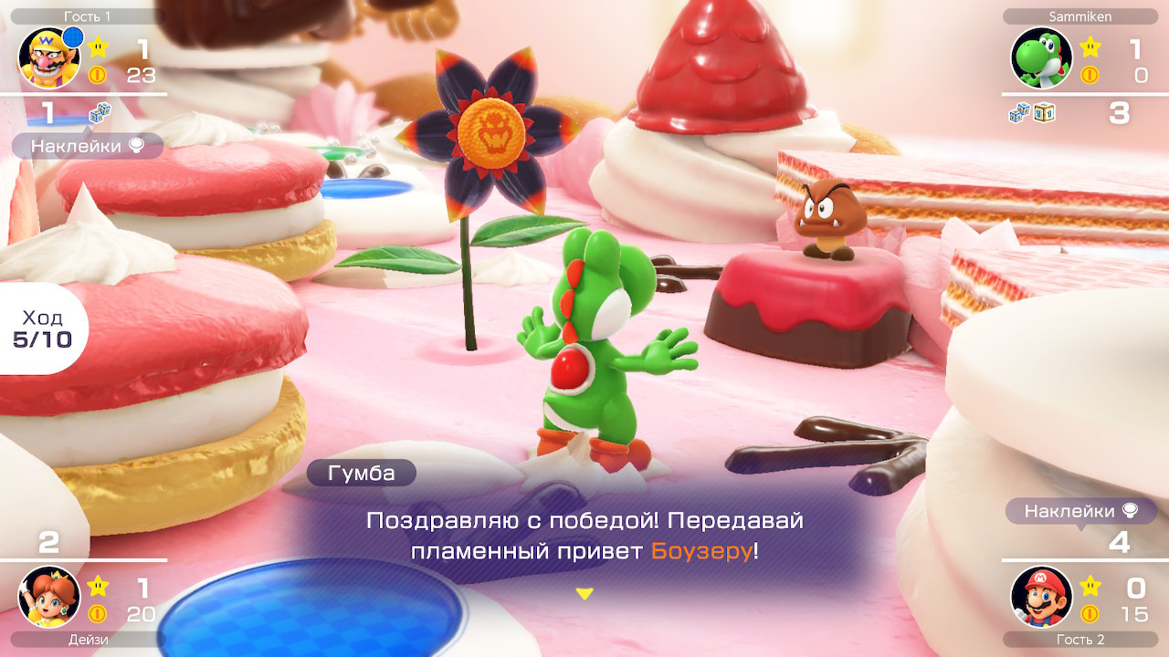 В целом, Mario Party Superstars прекрасно справляется со своей задачей. Но если бы я все же захотел придраться к чему-то, то обратил бы ваше внимание на дурацкую систему стикеров. Реализация отвратная: они появляются, стоит случайно дёрнуть стик, и загораживают ощутимую часть экрана. Вместо того, чтобы разработать адекватный голосовой чат, Nintendo в очередной раз вставляет костыли в свои проекты. Также мне совершенно непонятно, почему пропускать системные сообщения может только активный игрок. Приготовьтесь систематически напоминать вашим младшим братьям и сестрам о том, что сейчас их ход, а значит, и сообщения на экране могут закрывать только они. Разработчики могли бы, даже не знаю, добавить специальный пункт в настройках, чтобы делать всплывающие уведомления временными. Впрочем, сами настройки и без этого получились достаточно гибкими: вы можете выбрать скорость текста и анимаций ботов, добавить дополнительное количество ходов к партии и даже сохранить ее, чтобы продолжить позже. Можно также выбрать длительность матча, метод получения звёзд, отображение подсказок и гандикап. Немного расстроило полное отсутствие моушн-управления. Понимаю, что на этот раз компания делала акцент на доступность для всех моделей Switch, включая Lite, но добавить отдельную категорию для управления исключительно джойконами было бы вполне реально. Особенно если учесть, что перед каждым сеансом нам дают выбрать набор доступных мини-игр. Ну и напоследок хочу пожаловаться на русскую локализацию — они там Наташу Королёву что ли пригласили поработать диктором?