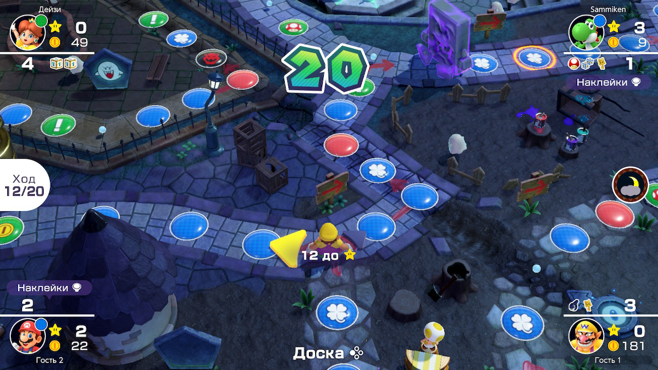 Не меньше меня впечатлил и набор игровых досок, которые, по сути, перекочевали из первых трех частей серии. Каждая из них уникальна и не похожа на другие. «Тропический архипелаг йоши» идеально подходит для обучения и неторопливого исследования местных механик: здешние тропы не представляют опасности, а эффект поля «Событие» меняет местами магазин звезд и надоедливого Боузера. «Орбитальная станция» заставит побегать от преследователей и стреляющего лучами спутника — он так и норовит избавить вас от лишнего золота. На «Именинном торте Пич» расположение магазина Тоадетты неизменно, однако коварные гумбы заставят пройти испытание семечком, провал в котором навяжет вам тернистый путь через десерт с ловушками. Тропы в «Дремучем лесу» непостоянны и обманчивы: поля «Событие» меняют направление указателей, а говорящие деревья могут как одарить полезным предметом, так и забрать что-то из ваших карманов. Мрачные земли «Страны страха»а чередуют день и ночь каждые пару ходов — текущее время суток влияет на доступность отдельных тропинок и некоторых ситуативных персонажей.