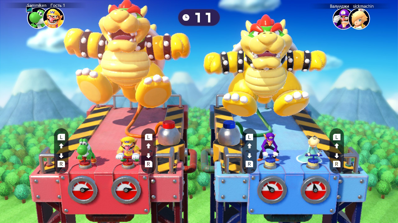 Всего в Mario Party Superstars ровно сотня мини-игр из 10 предыдущих частей серии. Разработчики отобрали лучших из лучших, заметно подтянув визуальную составляющую каждой. В жарких баталиях вам придется прыгать через огненную скакалку, удерживать равновесие под градом пушечных выстрелов, проходить проверку на внимательность с гумбами, уклоняться от поля астероидов в космическом просторе, гонять наперегонки по электризованному тоннелю, соревноваться в «тише едешь — дальше будешь» с Кусалкиным и даже участвовать в поедании пиццы на время. Доступ ко всей библиотеке можно получить из главного меню в любой удобный момент времени, однако запускать игры по отдельности мне показалось не так уж и интересно. В полной мере они раскрываются лишь во время увлекательных сессий в режиме Mario Party. Причем никогда не угадаешь, в каком составе пройдет то или иное испытание: двое на двое, трое на одного, каждый сам за себя или даже совместно.