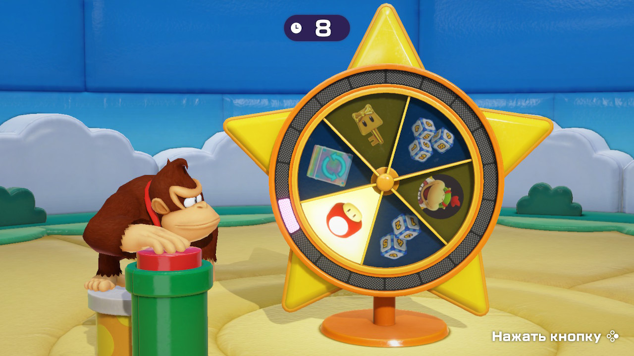 А ведь это и близко не всё, что могут предложить новые-старые локации. В отдаленных уголках каждой доски можно запросто наткнуться на поле Боузера — злобная рептилия способна ограничиться парочкой монет или же заграбастать все ваши пожитки. В особых случаях главный соперник Марио вполне горазд затащить всех участников в свою безумную мини-игру, чтобы кардинально поменять ход партии. Несложно наткнуться и на другие поля с условиями. Малыши Бу охотно своруют золотишко у ваших оппонентов, а за солидную плату готовы стащить даже звёзды. Камек со своей волшебной лампой не прочь раньше времени поменять местами день и ночь. Кроты переворачивают стрелки, меняя доступные тропы для передвижения. А Скромняги патрулируют космическую станцию на предмет лихачей. И это лишь неполный список всевозможных элементов, так или иначе влияющих на темп и настроение каждой сессии. Было бы нелишним вспомнить и о богатом выборе используемых предметов. В магазине Тоада на ваш выбор представлены двойные и тройные кубы, золотые трубы для мгновенного перемещения к Тоадетте, кубы проклятия, чтобы замедлить противников, и даже волшебные сундуки, позволяющие украсть один предмет противника на ваше усмотрение. Все это добро также хранится на специальных зеленых полях, так что вы с большим шансом будете страдать от переизбытка вооружения, а не от его недостатка.