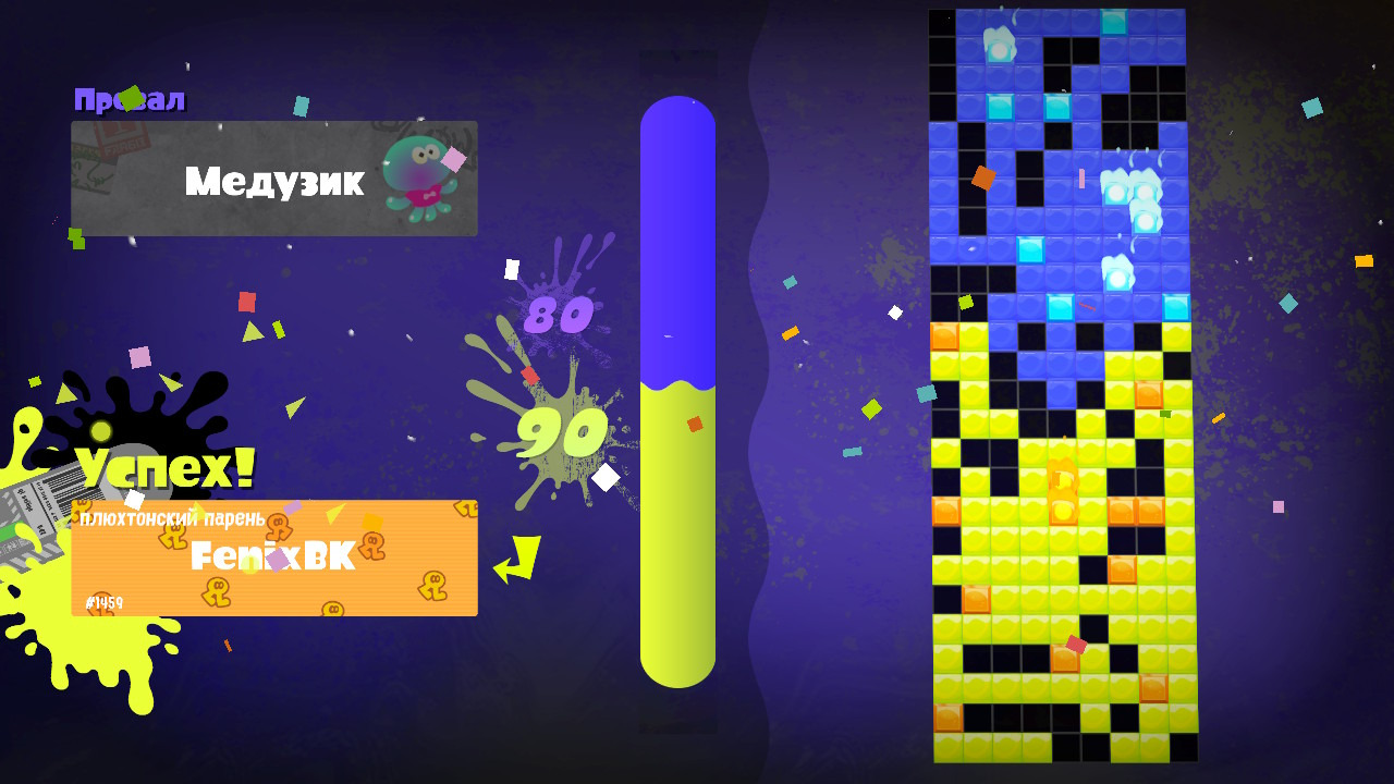 - Мультиплеер и его основа не поменялись. Формула та же: две команды, состоящие из четырёх человек (или, точнее, кальмаров) стремятся закрасить как можно большую территорию арены. Стены в учёт не идут, по чужим чернилам долго ходить нельзя, а чтобы передвигаться быстро и пополнять боезапас, нужно погружаться с головой в краску (у каждой команды свой цвет). Врагов позволено убивать (вернее, «плюхать»), но они быстро возвращаются в бой, запрыгивая со своей стороны карты. Это самый популярный классический режим «Бой за район». Есть и другие варианты стычек, например, во время сплатфестов. Однако самые брутальные и горячие потасовки – это рейтинговые. Тут ребята с иероглифами в никах максимально освоились и «кошмарят» всех в режимах «Бой за башню», «Устробол», «Мегакарп», а также в доступном вне рейтинговых баталий сражении «Бой за район».