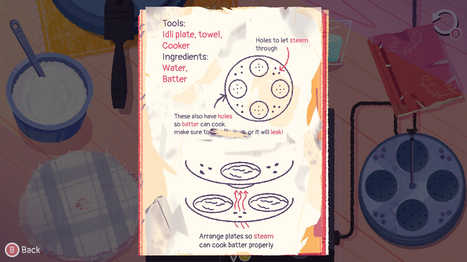 Наконец-то, свершилось, мы добрались до кулинарии! Если в сугубо сюжетной части Venba мы в основном просто листаем сцены и лишь иногда незначительно влияем на них через выбор реплики (дополнительный повод пройти игру дважды), то в приготовлении индийско-тамильских блюд геймер порой сталкивается с пусть и несложными, но всё равно интересными головоломками. Вместо подробных рецептов обычно проходится иметь дело с неоднозначными иллюстрациями, воспоминаниями и так себе сохранившимися записями в тетрадках. И это при том, что в части блюд аж более дюжины ингредиентов, которых нужно использовать в определённом порядке: например, чтобы лук был поджаристым, а не потушился из-за рано добавленных помидоров. Впрочем, за ошибки тут не наказывают: вам намекают на их суть и позволяют попробовать приготовить всё заново. Кроме того, добрая половина рецептов вообще элементарна – вплоть до того, что иногда вам доступно одно-единственное возможное действие. Зато сами действия в Venba бывают разные: нужно перемешивать, процеживать, резать, щипать, пропаривать, обжаривать и делать целый ряд иных процедур, используя даже странную аутентичную индийскую утварь, какую в той же России едва ли встретишь.