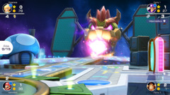 А ведь это и близко не всё, что могут предложить новые-старые локации. В отдаленных уголках каждой доски можно запросто наткнуться на поле Боузера — злобная рептилия способна ограничиться парочкой монет или же заграбастать все ваши пожитки. В особых случаях главный соперник Марио вполне горазд затащить всех участников в свою безумную мини-игру, чтобы кардинально поменять ход партии. Несложно наткнуться и на другие поля с условиями. Малыши Бу охотно своруют золотишко у ваших оппонентов, а за солидную плату готовы стащить даже звёзды. Камек со своей волшебной лампой не прочь раньше времени поменять местами день и ночь. Кроты переворачивают стрелки, меняя доступные тропы для передвижения. А Скромняги патрулируют космическую станцию на предмет лихачей. И это лишь неполный список всевозможных элементов, так или иначе влияющих на темп и настроение каждой сессии. Было бы нелишним вспомнить и о богатом выборе используемых предметов. В магазине Тоада на ваш выбор представлены двойные и тройные кубы, золотые трубы для мгновенного перемещения к Тоадетте, кубы проклятия, чтобы замедлить противников, и даже волшебные сундуки, позволяющие украсть один предмет противника на ваше усмотрение. Все это добро также хранится на специальных зеленых полях, так что вы с большим шансом будете страдать от переизбытка вооружения, а не от его недостатка.